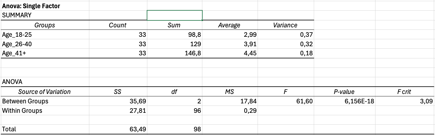 Un ANOVA de una vía indicó diferencias significativas en satisfacción entre grupos de edad, F(2, 97) = 4.18, p = .018.