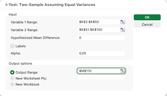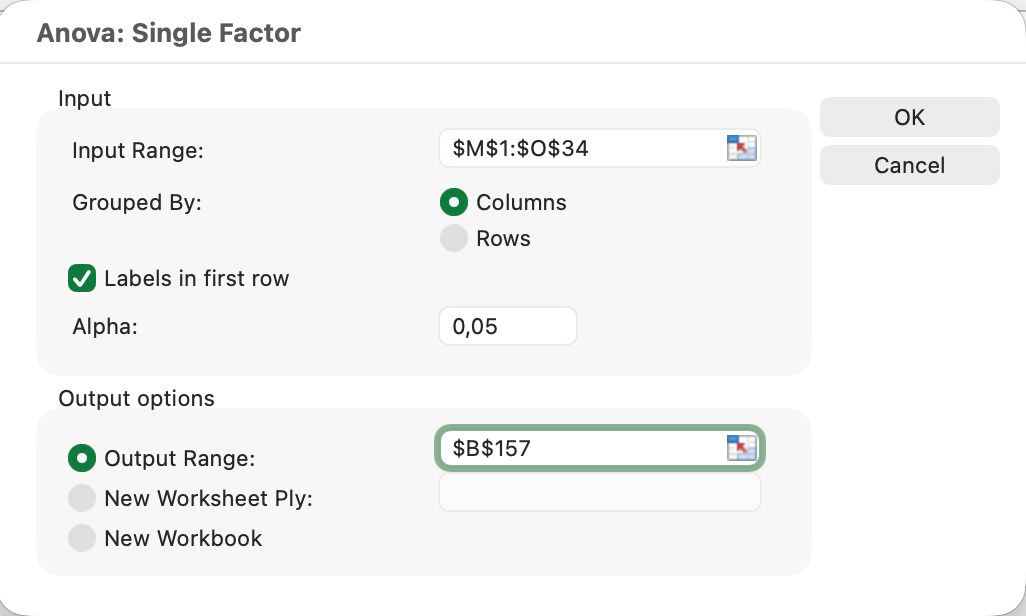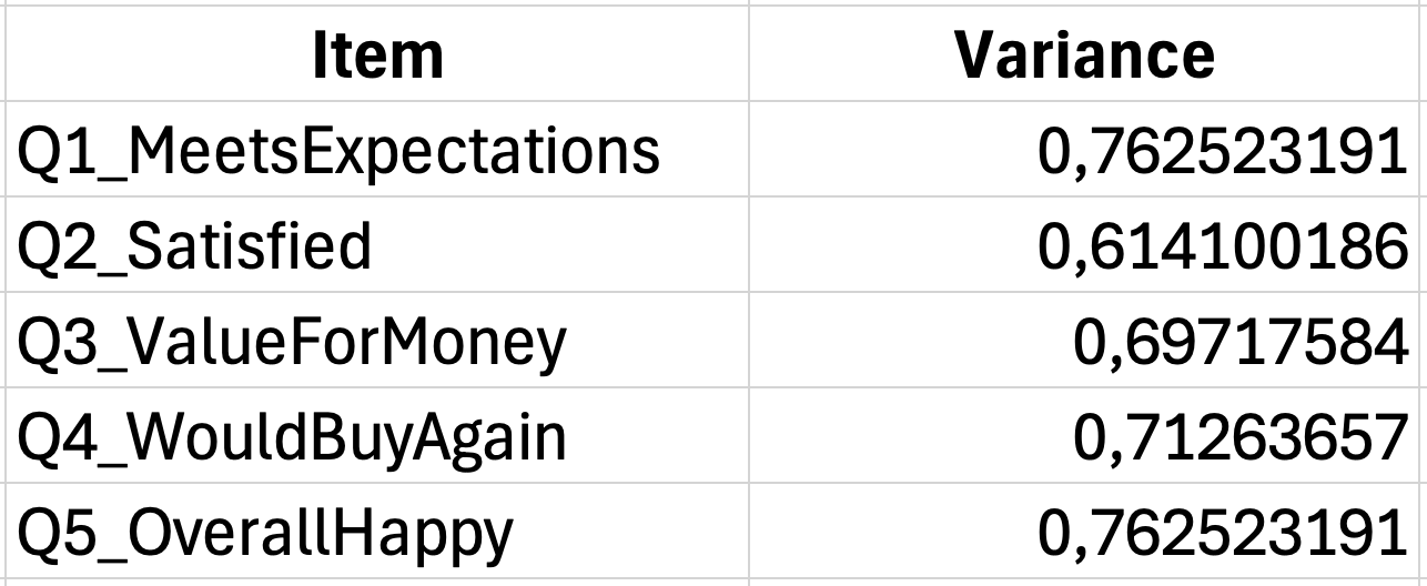 =VAR.S(B2:B31)Repite esto para cada columna de ítems. Coloca estos cálculos de varianza en un área de resumen debajo de tus datos.