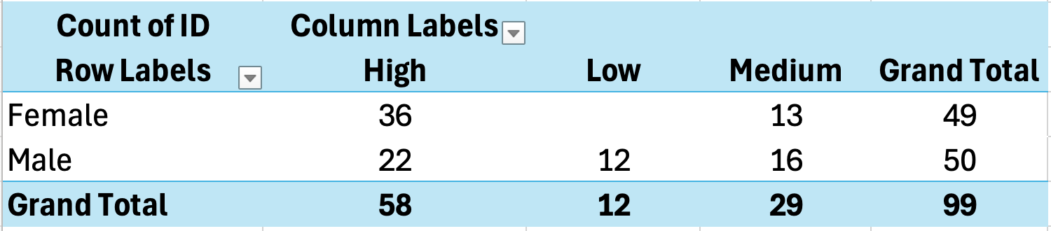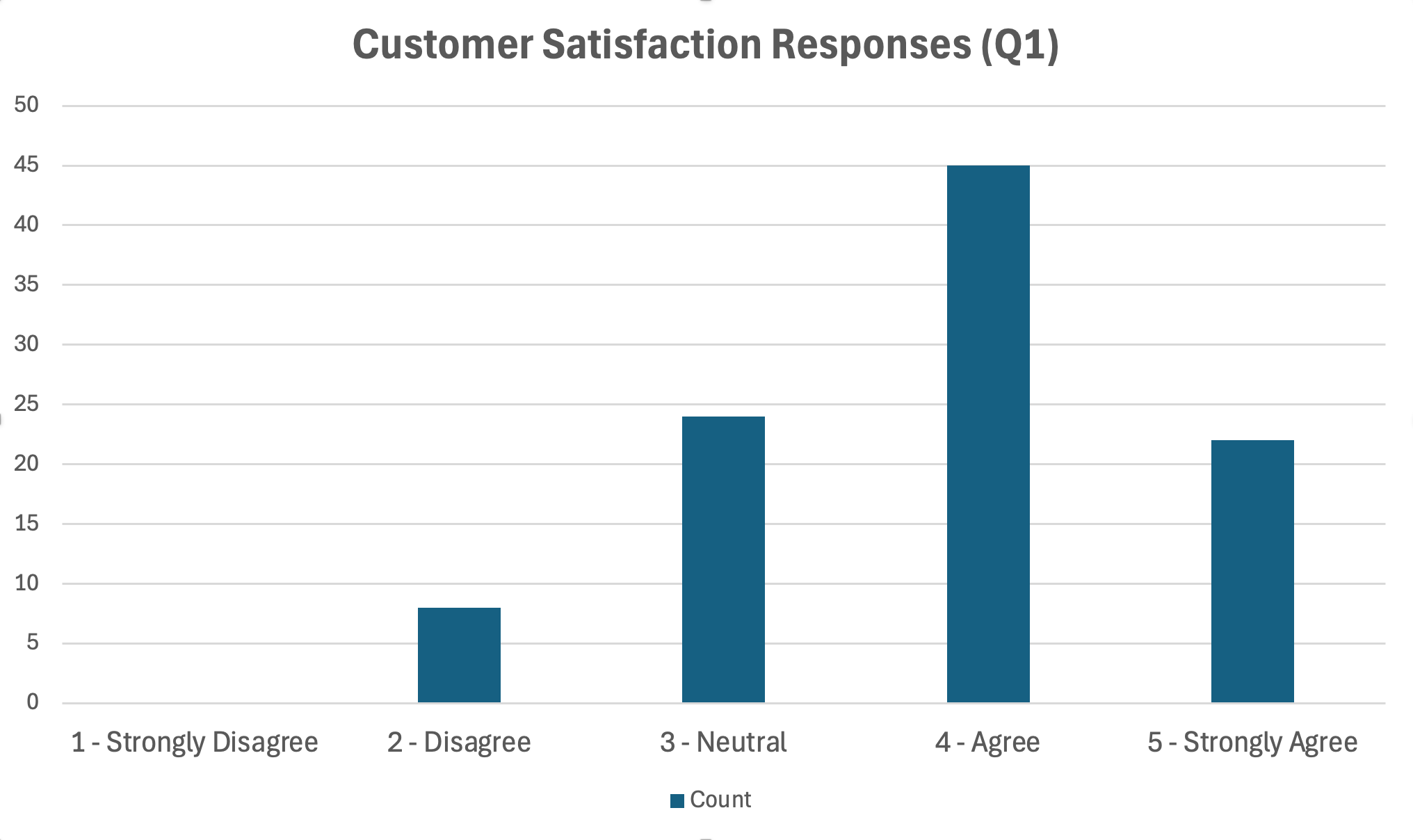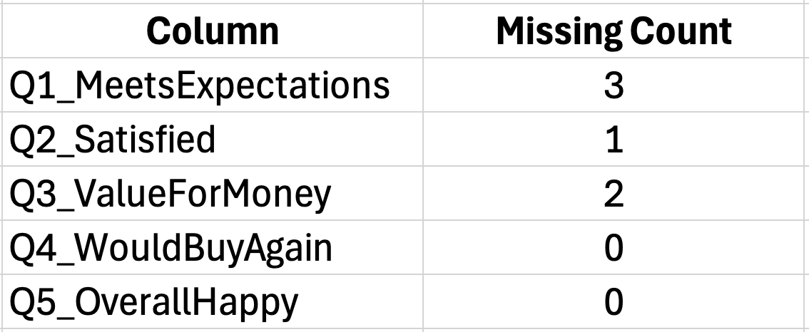 =COUNTBLANK(B2:B101)Esto te indica cuántos encuestados omitieron cada pregunta. Algunos valores faltantes son normales. Si una pregunta tiene muchas más respuestas faltantes que otras, investiga por qué. La pregunta puede ser confusa o sensible.