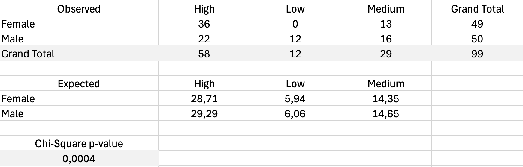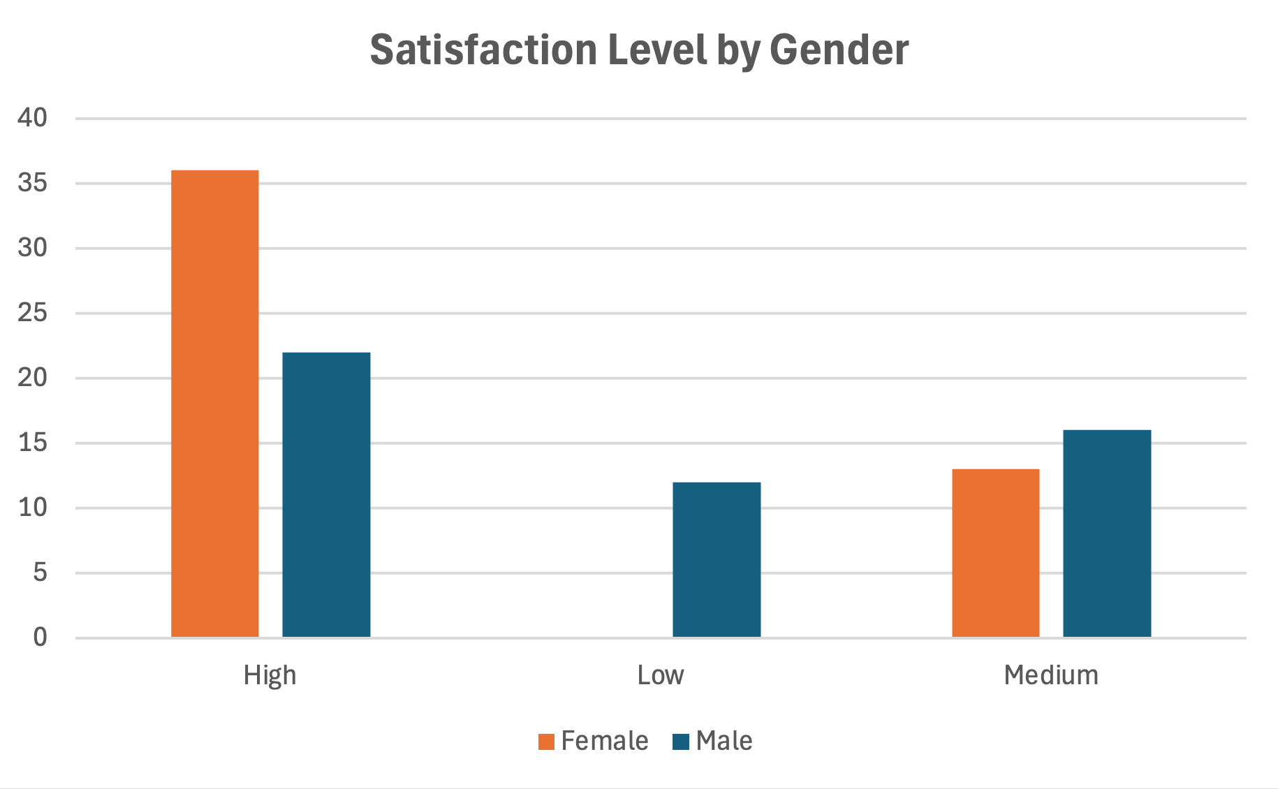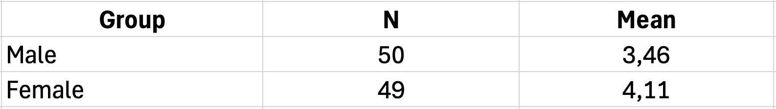 Una prueba t para muestras independientes reveló una diferencia significativa en satisfacción entre participantes masculinos (M = 3.52, DE = 0.79) y femeninos (M = 3.78, DE = 0.84), t(98) = -2.14, p = .035.