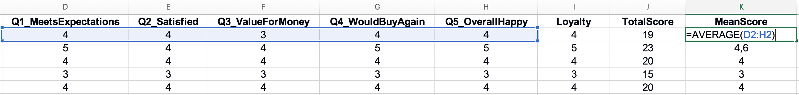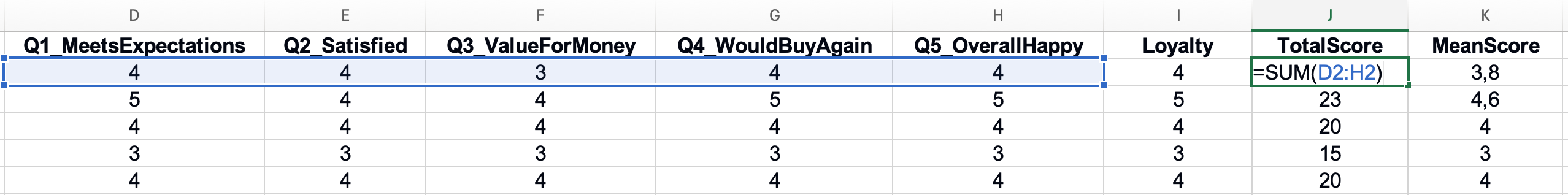 =SUM(B2:F2)Esto calcula el puntaje total para el Encuestado 1 a través de los ítems en las columnas B a F. Copia esta fórmula hacia abajo para todos los encuestados.