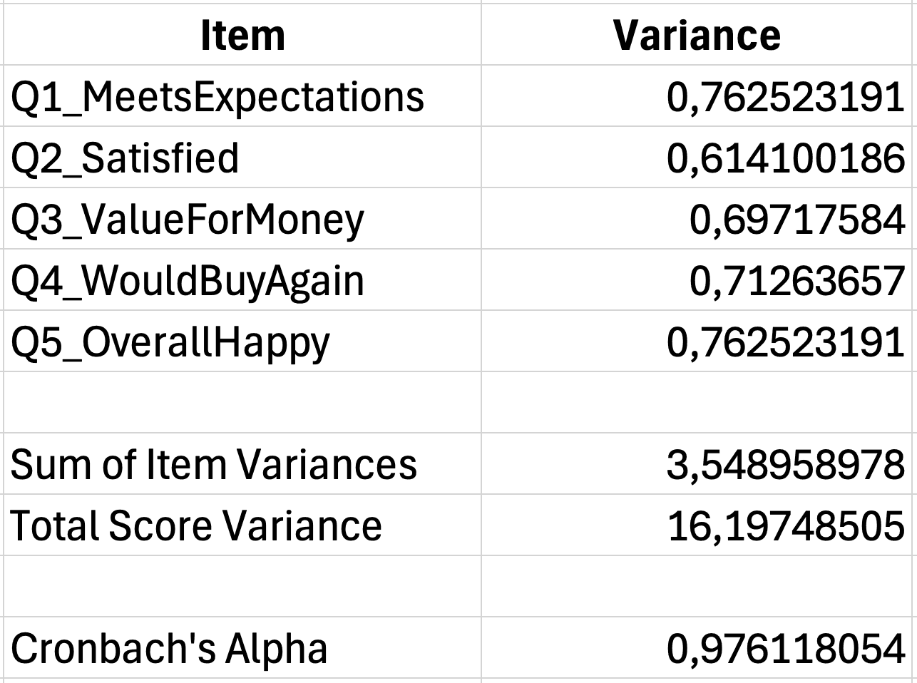 El Alfa de Cronbach va de 0 a 1. Valores más altos indican mayor consistencia interna entre los ítems de tu escala. La fórmula es: