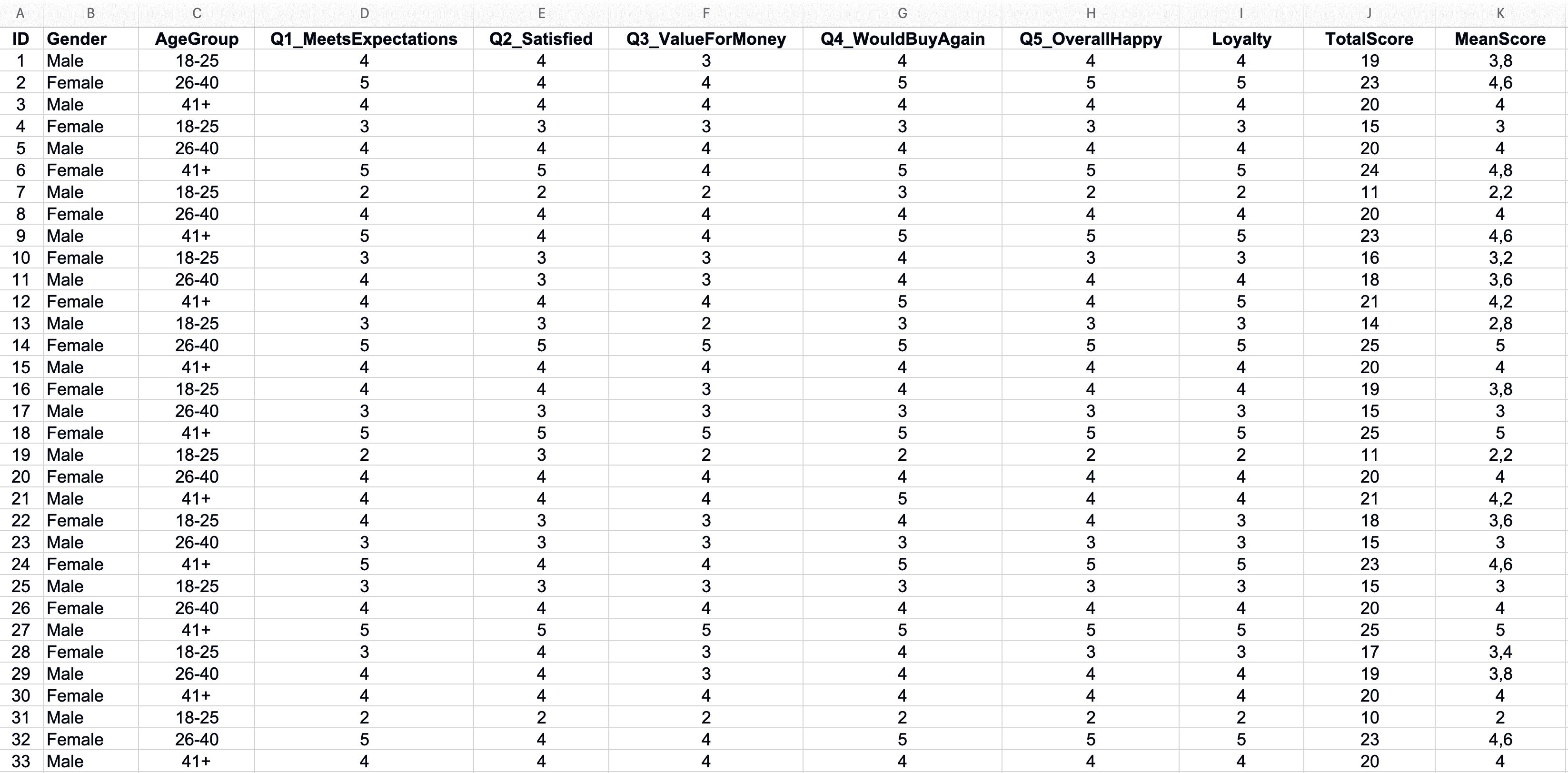 Antes de entrar en los cálculos, necesitas datos correctamente estructurados. La siguiente sección cubre cómo preparar tus respuestas de encuesta para el análisis.