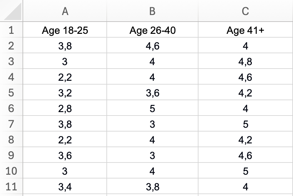 Figura 2: Disposición correcta de datos para ANOVA de un factor: cada grupo de edad en una columna separada con encabezados descriptivos