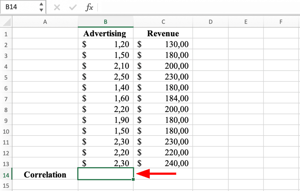 Volvamos a nuestro ejemplo de la tienda de ropa y aprendamos a calcular el coeficiente de correlación de Pearson en Excel para determinar si existe una relación entre cuánto gastamos en publicidad y cuánto dinero ganamos.