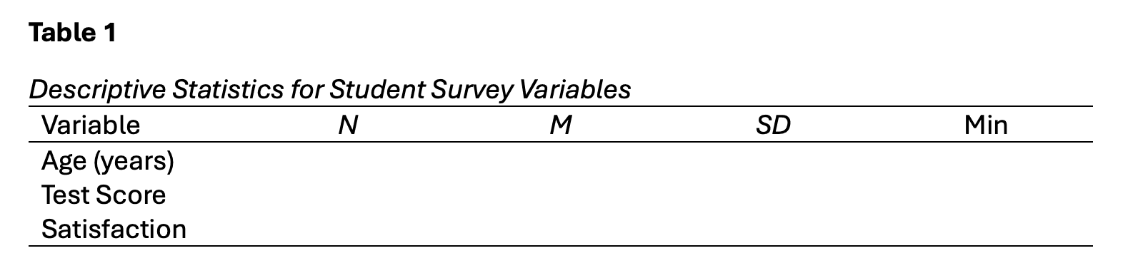 - Create column headings: Variable, N, M, SD (or other relevant statistics)
