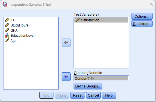 Figure 2: Independent-Samples T Test dialog with Satisfaction as the test variable and Gender as the grouping variable