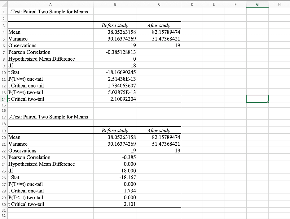 =T.TEST(A2:A20, B2:B20, 2, 1)