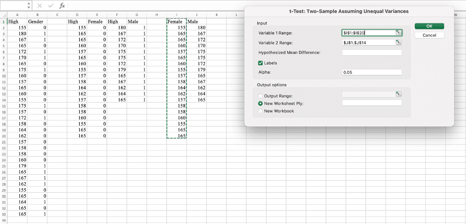 - Rango de variable 2: Selecciona los datos de estaturas masculinas (incluyendo etiqueta)