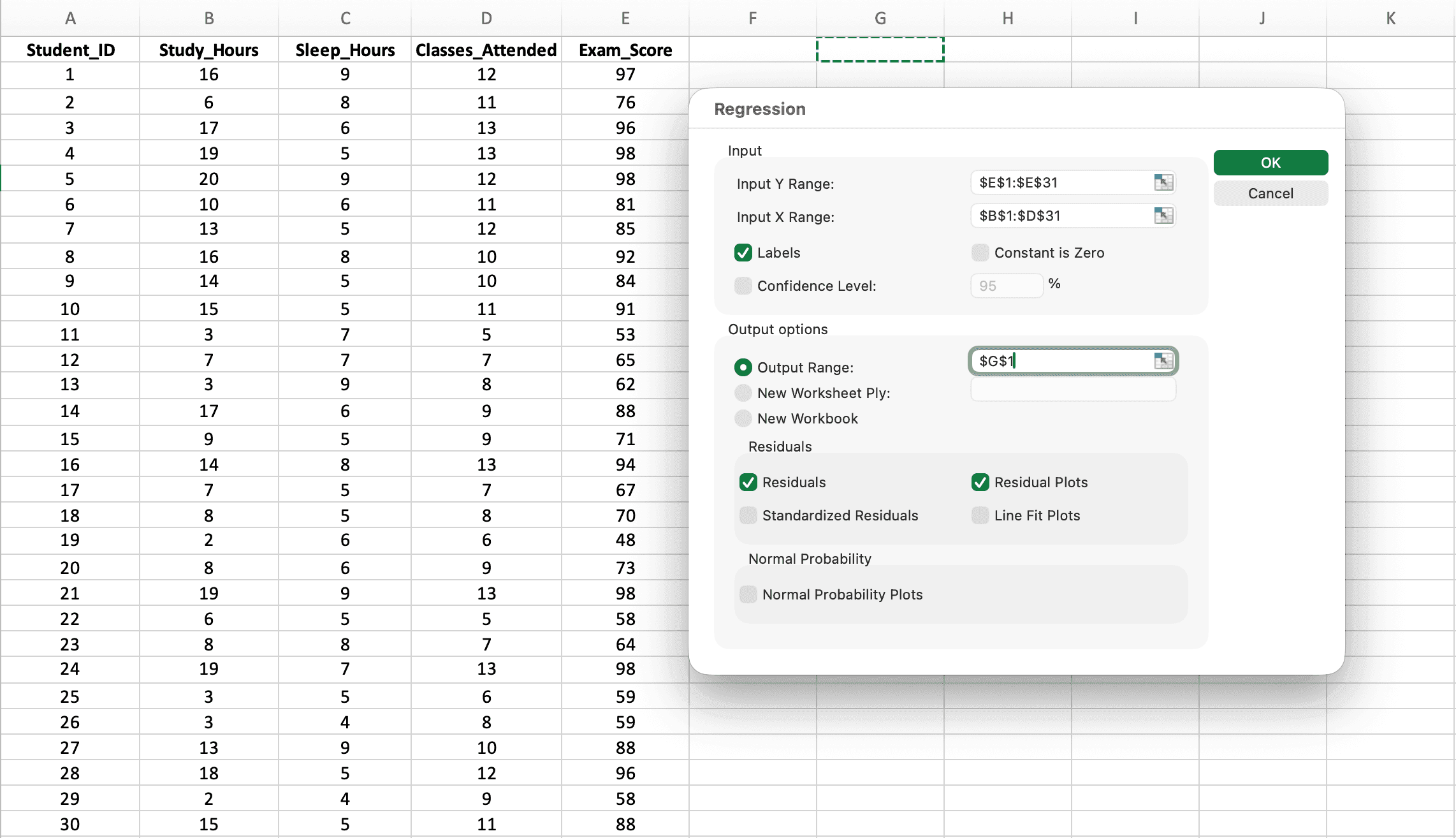 Antes de comenzar: Esta guía asume que entiendes la regresión lineal simple. Léela primero si eres nuevo en regresión. También necesitarás Excel con Analysis ToolPak instalado. Si aún no lo has activado, consulta nuestra guía sobre cómo agregar Data Analysis en Excel.