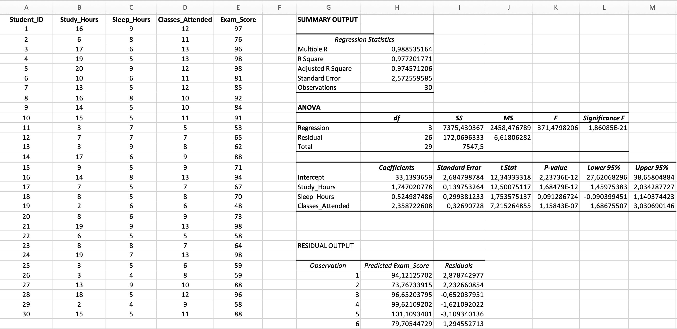 A lo largo de esta guía, usaremos un conjunto de datos realista de tesis que examina cómo múltiples factores predicen el rendimiento en exámenes de 30 estudiantes universitarios. Esto demuestra una pregunta de investigación típica: "¿Las horas de estudio, la calidad del sueño y la asistencia a clase juntas predicen el rendimiento académico?"