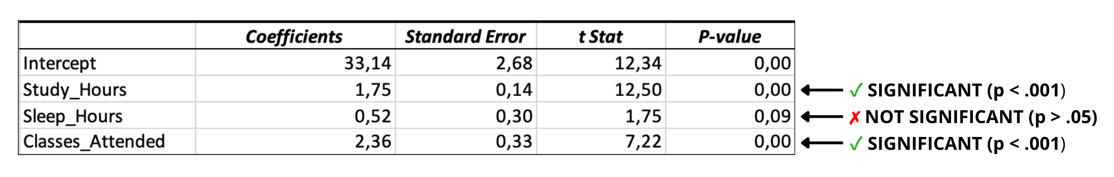 En resumen: Cuando ves β₀ en un libro de texto e "Intercept" en Excel, se refieren a lo mismo. Cuando tu profesor escribe β₁ en el pizarrón y Excel muestra un coeficiente de 2.15, es el mismo concepto. Excel etiqueta su salida simplemente como "Coefficients" independientemente de la notación que use tu libro de texto.