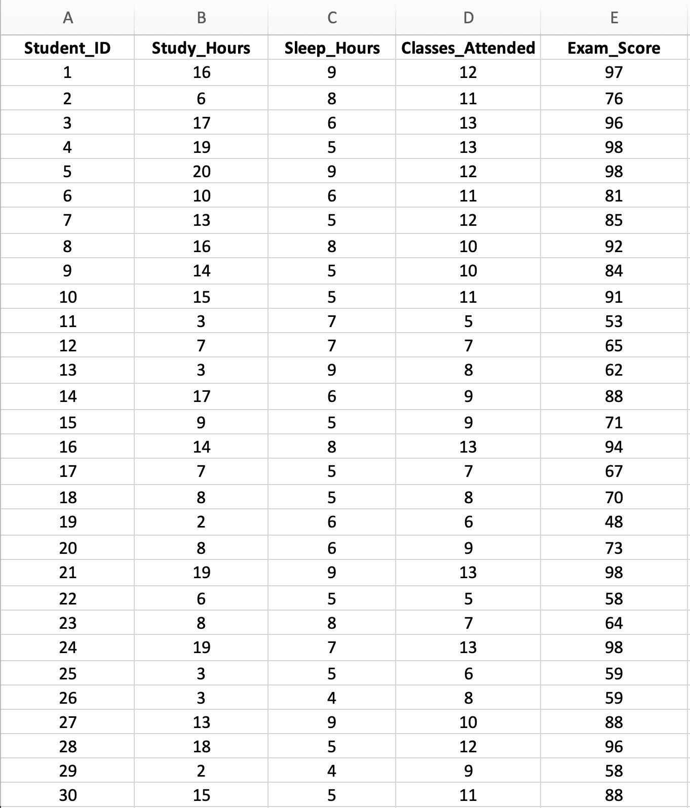 Figura 2: Conjunto de datos de ejemplo con 30 estudiantes mostrando tres variables predictoras (Horas de Estudio, Horas de Sueño, Clases Asistidas) y una variable de resultado (Calificación del Examen)
