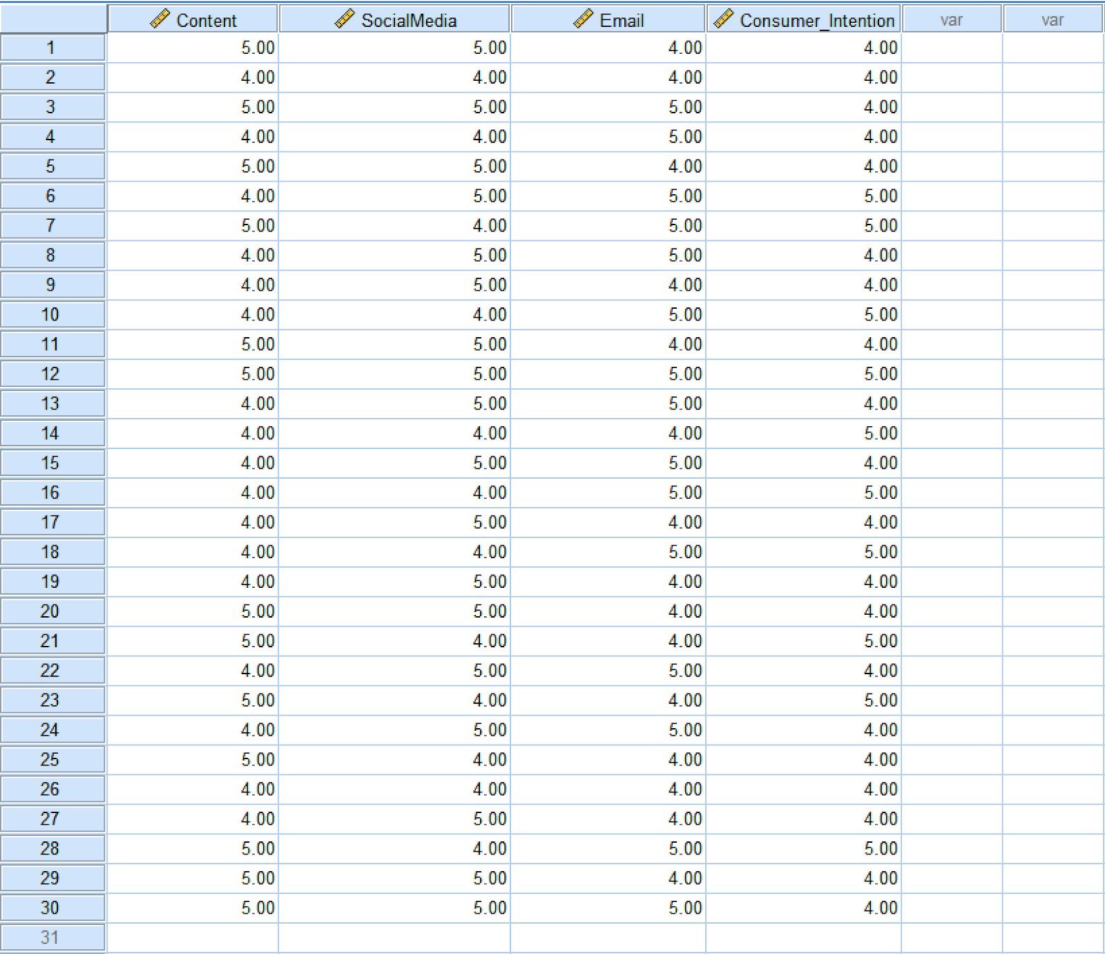 El conjunto de datos de ejemplo contiene 30 muestras donde Content, SocialMedia y Email son variables independientes (predictores), y Consumer_Intention es la variable dependiente (resultado). Después de descargar, descomprime el archivo y haz doble clic en el archivo con extensión .sav para importar el conjunto de datos en SPSS.