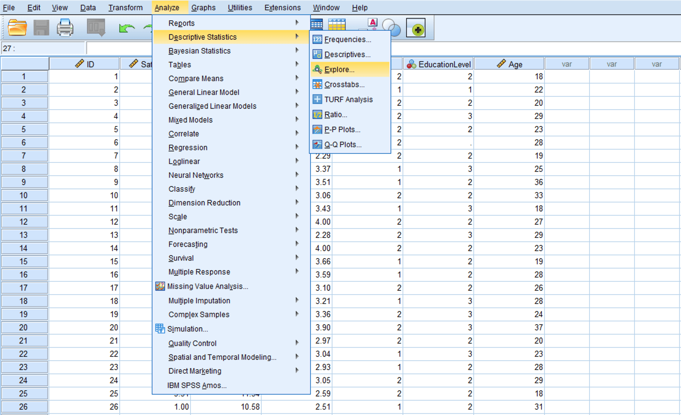 Figura 1: Navigheaza la Analyze > Descriptive Statistics > Explore in meniul SPSS