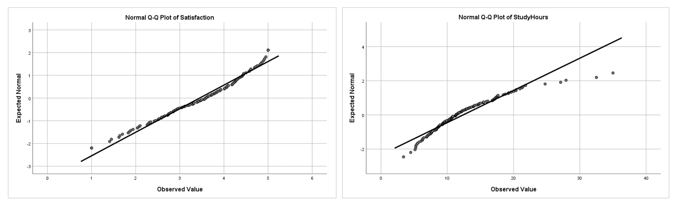 Figura 5: Grafice Q-Q comparate: Satisfaction (stanga) urmeaza diagonala indeaproape, indicand normalitate aproximativa; StudyHours (dreapta) se curbeaza la capatul superior, indicand asimetrie la dreapta